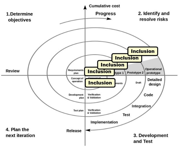The Spiral model supports inclusion by framing development as a sequence of iterative cycles driven by risk assessment. Within this model, exclusion can be explicitly treated as a project risk: who might be excluded, how exclusion might occur, and what the consequences would be if it is not addressed.